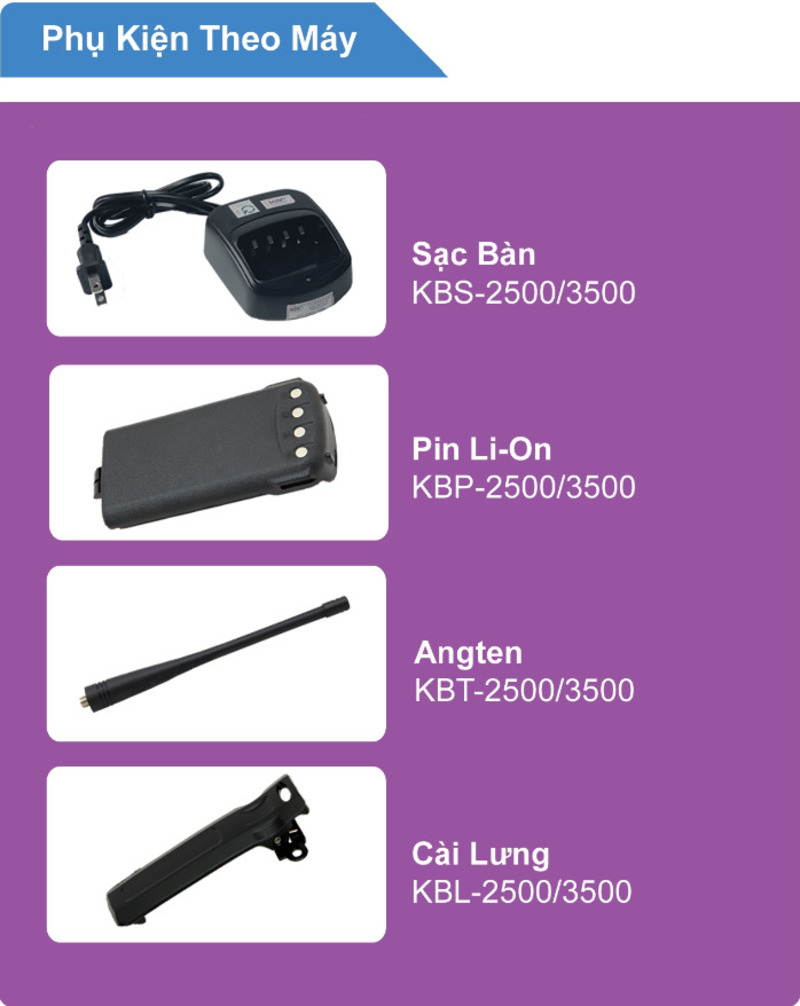 - Máy bộ đàm KBC PT-2500/3500 đã được cài đặt các tần số sử dụng phù hợp (các kênh đã có tần số sẵn).